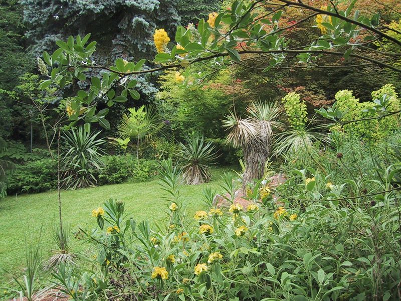 Der mediterrane immergrüne Strauch hat sich bei mir als erstaunlich winterhart erwiesen.Passend dazu re oben Argyrocytisus, im Hintergrunf Y. thompsoniana