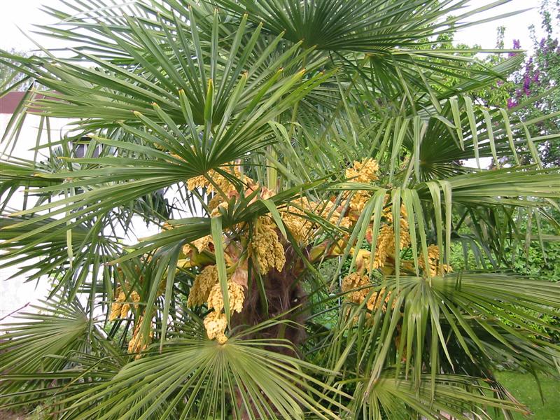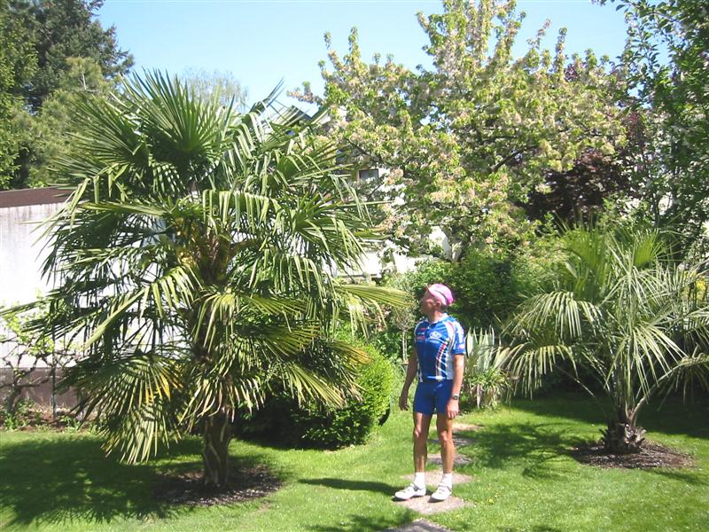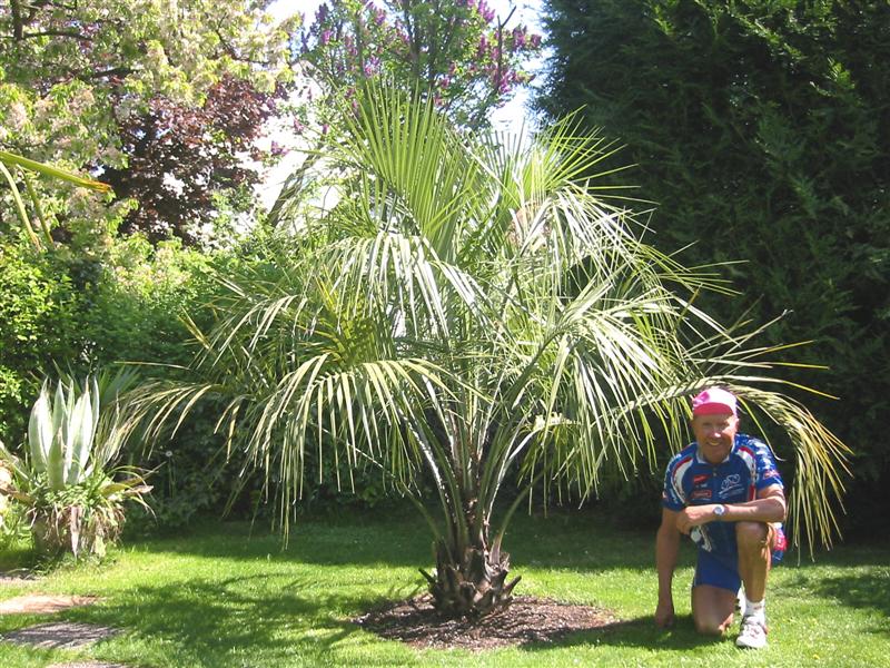 Eddi neben meiner Butia. Die Butia entfaltet bereits den 2 Fieder und wächst zur Zeit schneller wie die benachbarte Trachy die Ihre Kraft an den Blüten verausgabt.
