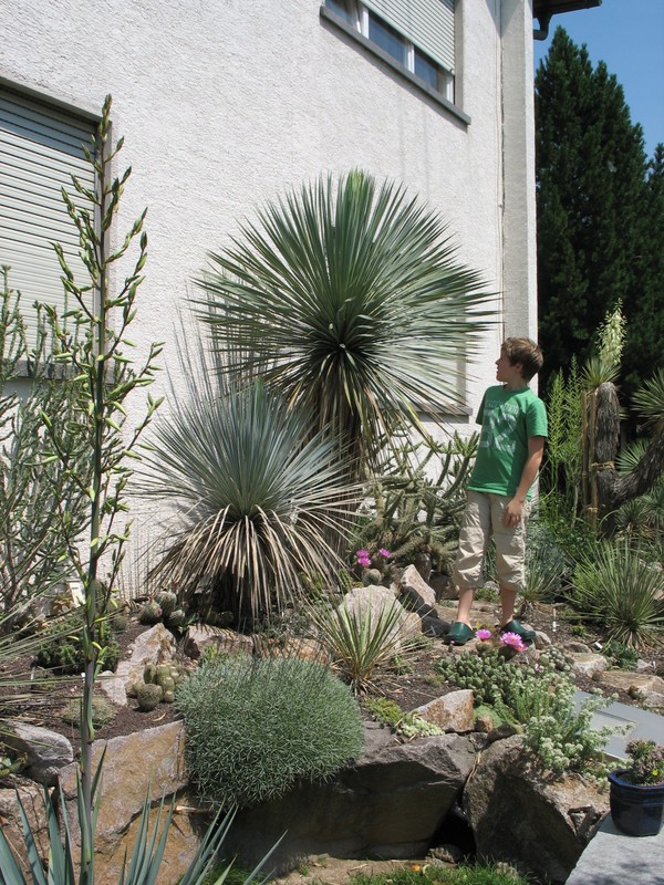 und hier ein Bild von Anfang dieses Monats. Junior ist ordentlich gewachsen in den 3 Jahren. Aber gegen die Yucca rostrata hat er keine Chance.