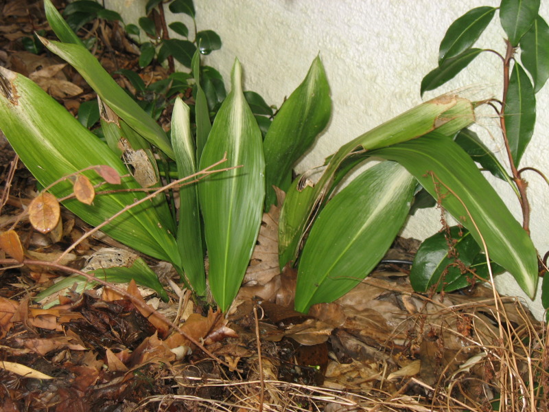 Die hier sichtbaren Blattschäden von Aspidistra elator 'Asahi' stammen vom Winter zuvor. Dahinter die immergrüne Kletterhortensie Hydrangea seemannii aus Mexiko, ebenso unbeschädigt wie die sehr ähnliche (ausnahmsweise unbeschädigte) H. serratifolia aus Chile.