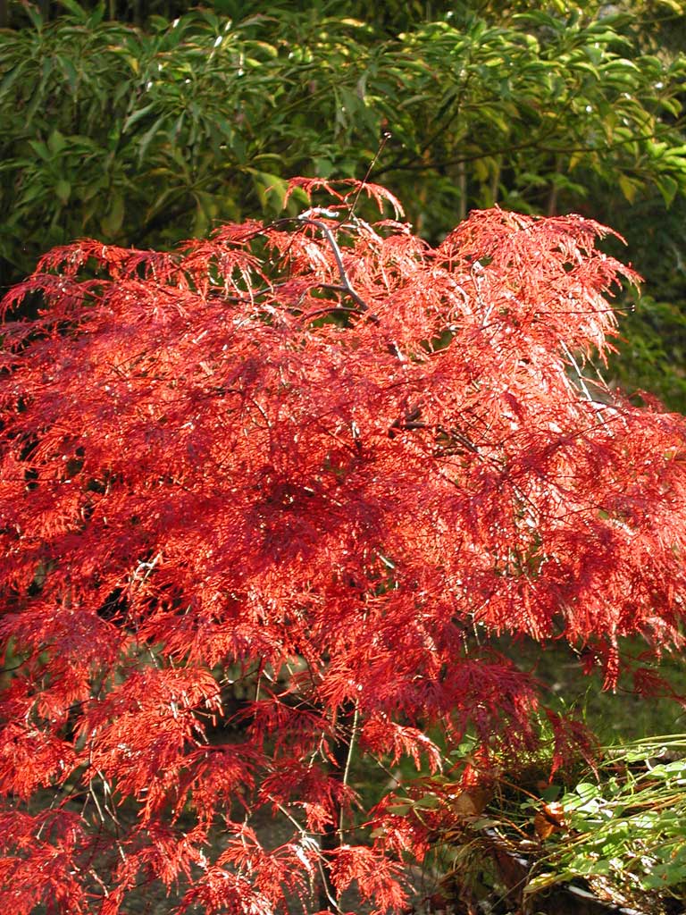 /*Acer jap. 'Red Filigree Lace'*/ der Ahorn mit den am feinsten geschnittenen Blättern, eine extrem langsam wachsende Rarität.Im Hintergrund Trochodendron aralioides.