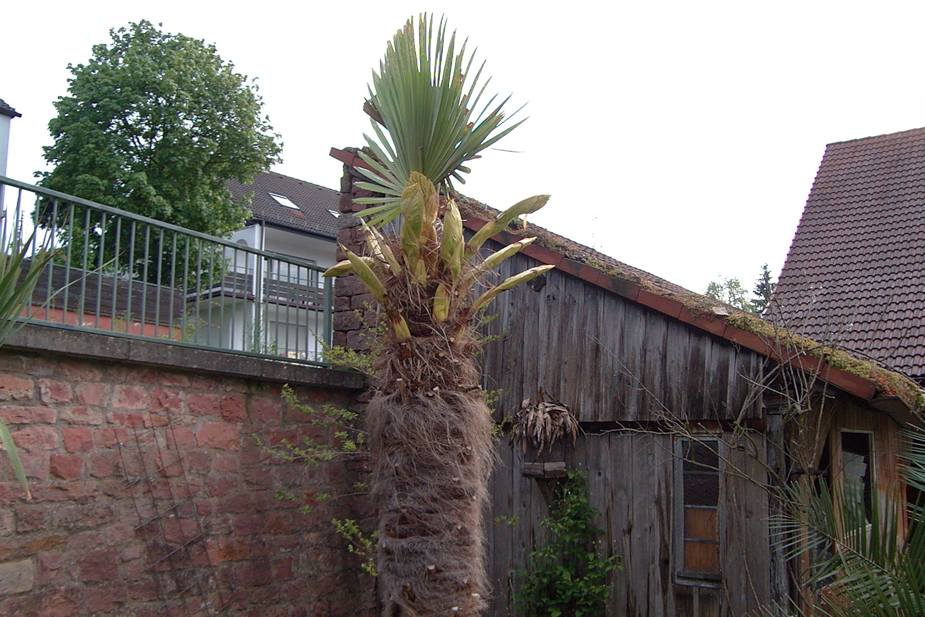 hier noch mal ein Bild meiner Trachy.Sie hat 9 weibliche Bl�ten.Das,was man jetzt als Bl�tter(2St�ck) sieht waren nach dem Winter Speere.An dem vorderen Wedel sieht man in der Mitte noch den schwarzen Filzstiftstrich quer �ber das Blatt.Aber jetzt steckt die Trachy die ganze Kraft erst mal in die Bl�ten.Ich habe mal geh�rt,dass die Bl�ten ohne die dazugeh�renden Bl�tter nicht gedeihen k�nnten.Diese These halte ich angesichts der sich bei mir entwickelnden Bl�ten jetzt aber f�r unwahrscheinlich.