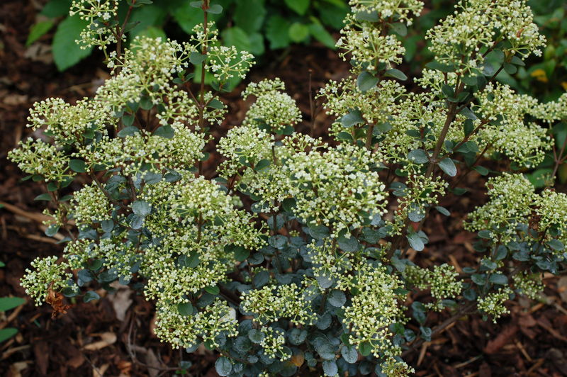 /*Viburnum harryanum*/ mit seinen kleinen immergrünen münzförmigen Blättern ist z.Zt. eine wahre Zierde