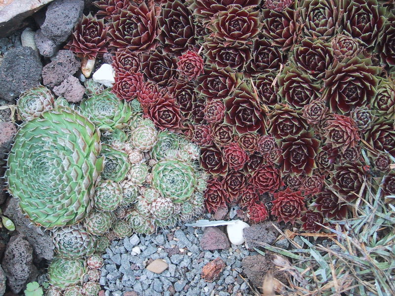 auf 2 künstlich angelegten Sukkulentenbiotopen, die absolut natürlich wirken, imponieren u.a. Orostachys und Sempervivum-Arten