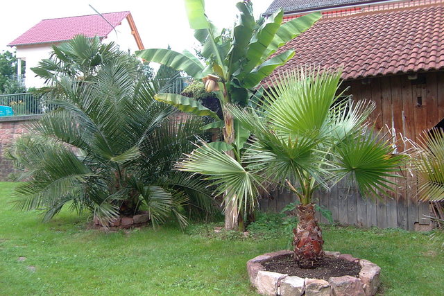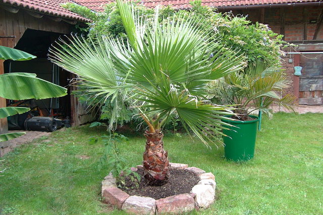 habe heute mal wieder einige Bilder gemacht.Erfreut bin ich von dem guten Wachstum der Washingtonia robusta nach ihrem ersten Freilandwinter.Obwohl ich ihr im Herbst fast alle Wedel abgeschnitten hatte,öffnet sich gerade der 7.Wedel.