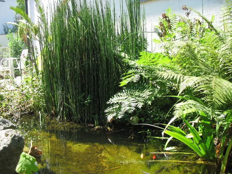 und hier gehört /*Equisetum hymale var. robustum*/ in meinem Garten eigentlich hin, in den Teich wo der Schachtelhalm einen dichten Bestand moderater Größe bildet. Nach über 15 Standjahren schiebt er sich aber mit dichten Wurzelfils langsam aber sicher über die Wasseroberfläche.