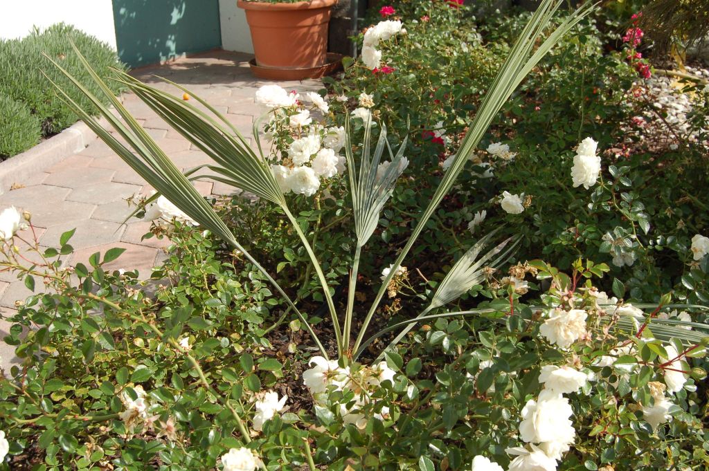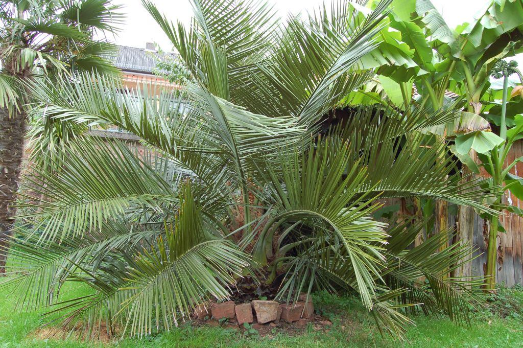 Die Palmen hatten Anfang September von morgens 9.00 h bis abends 18.30 h einen vollen sonnigen Standort. Der Besitzer ist selbst ein großer Pflanzenfreund und hat bereits eine Musa B. Trachys, Oleander etc.
