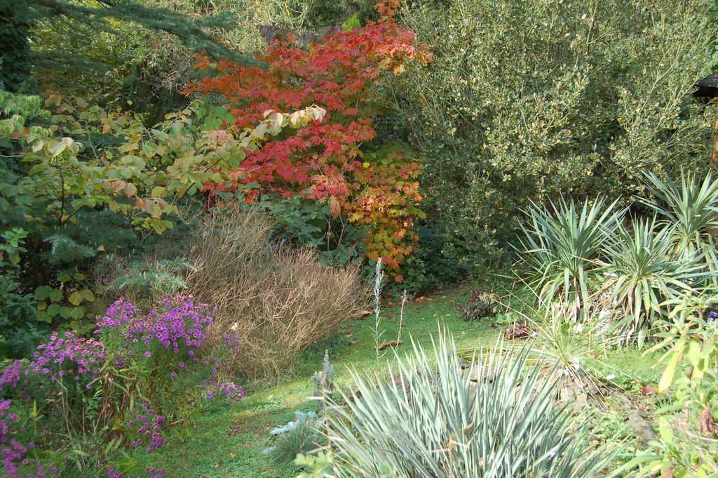 die ersten mit intensiver Herbstfärbung sind /*Acer japonicum Vitifolium*/ li und unmittelbar re daneben mehr in orange Tönen /*Acer pseudosieboldianum*/ AM#