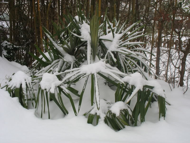 im Hochbeet oberhalb der Mauer Rhapidophyllum hystrix - meine kleine - sieht erwartungsgemäß noch gut aus.