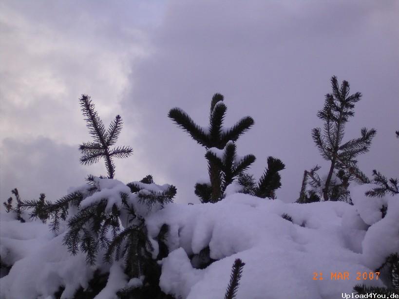 Peter aus Röhrnbach hat mir heute diese Fotos gesendet. Damit ist der Beweis erbracht, dass Araucaria araucana mind. – 30° überlebt. Eine Sensation, wie ich finde. Eine Araucaria araucana am kältesten bewohnten Ort Deutschlands, unglaublich!