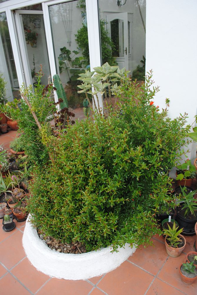 Punica granatum nana kommt auch langsam wieder zu einem Habitus. Zumindest blüht er wieder