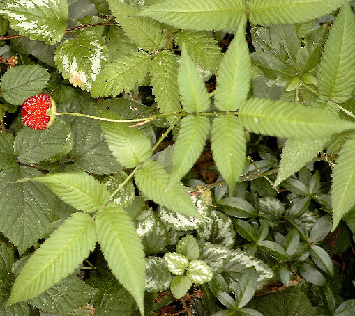 ... der japanische Rubus illecebrosus hat erdbeerartige Fruechte und unterseits gruene Blaetter.