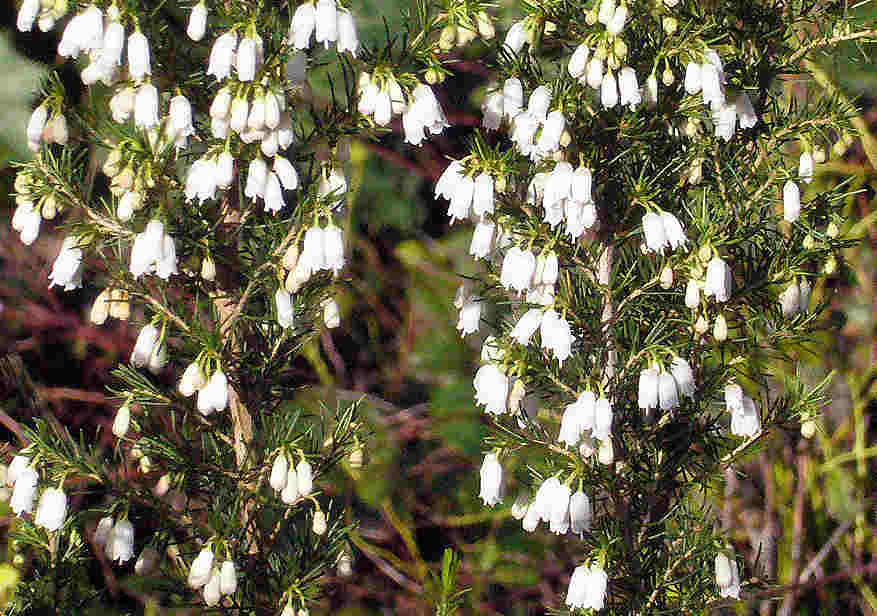 /*Erica lusitanica*/ steht zur Zeit in Vollblüte, wie das heutige Foto zeigt. Die Pflanze ist erst kaum 1 m hoch. Vor etwa 20 Jahren habe ich die Art schon einmal gepflanzt, und sie wuchs mit dickem Stamm auf über 2,5 m Höhe heran. An Winterschutz habe ich damals überhaupt nicht gedacht, so dass der schmuckvolle Strauch zur willkommenen Beute des Killerwinters 1995/96 wurde.