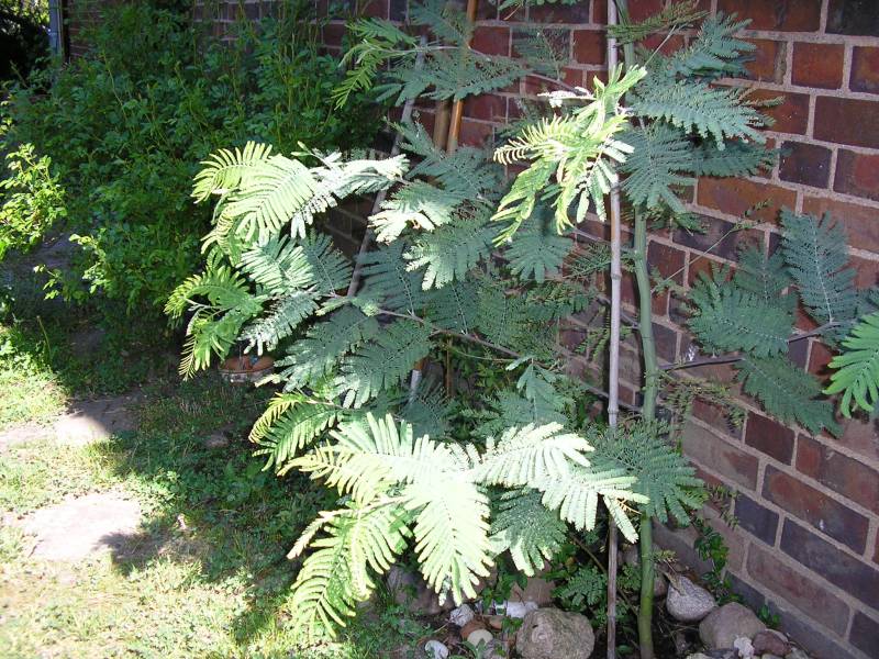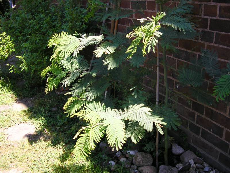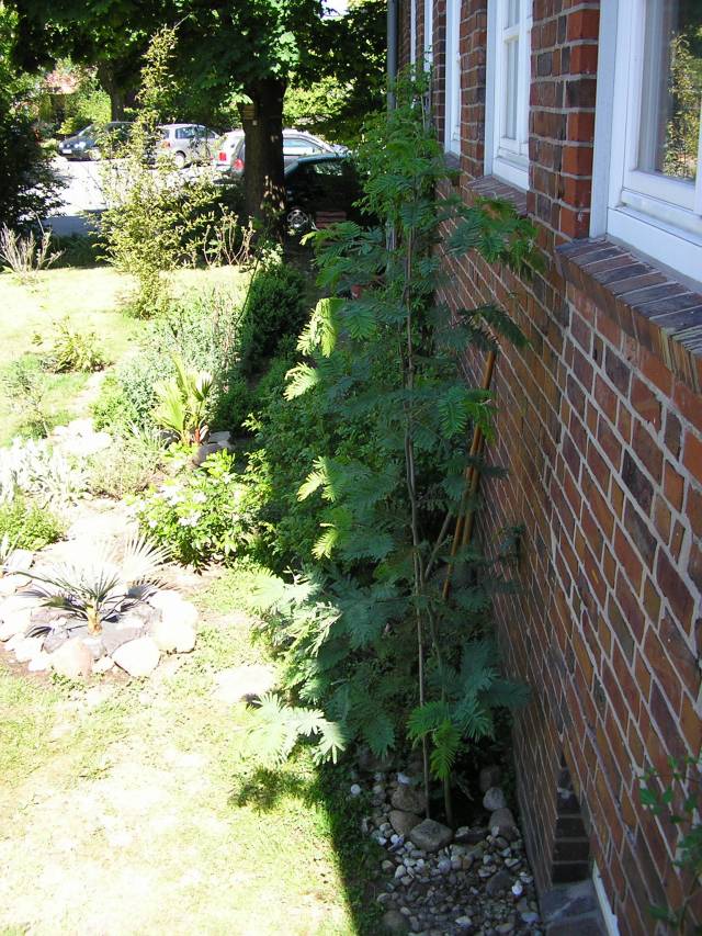 :um die Mittagszeit wandert die Acacia dealbata in die Sonne. Bis zum späten Abend kann sie Sonne und Wärme tanken, zusätzlich auch nachts noch die enorme Wärmeabstrahlung der Ziegelmauer aufnehmen.