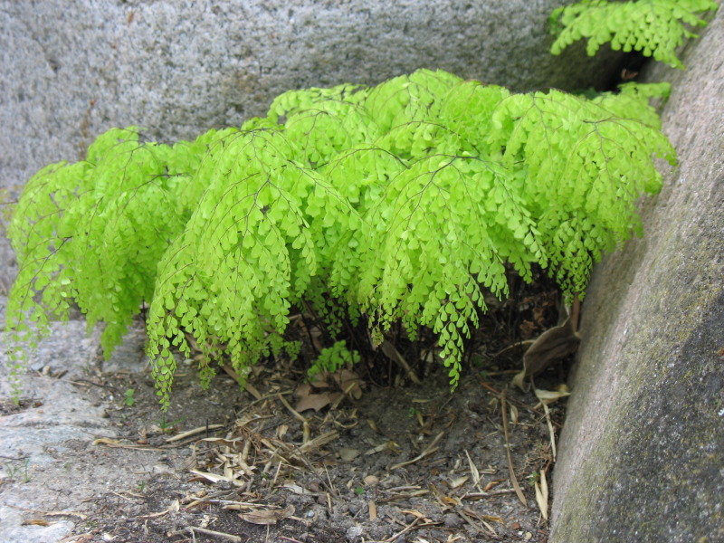 frisches Grün beim Frauenhaarfarn Adianthum venustum, der an geeigneten Stellen auch mal gern zum Wuchern neigt. Gepflanzt wurde er ursprünglich hinter den dicken Findlingen und hat sich irgendwie den Weg dazwischen durch verschafft