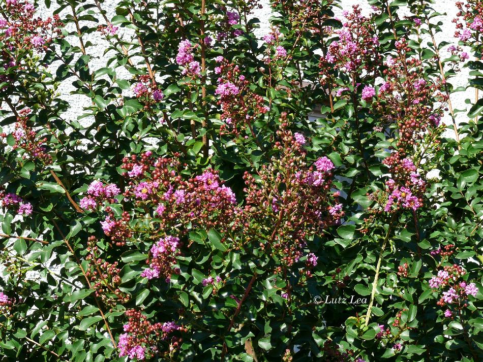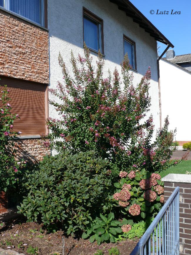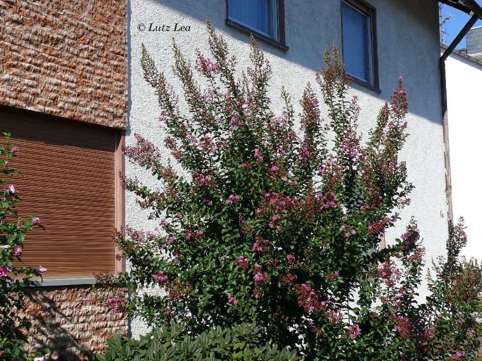 vor ein paar Tagen hatte ich es bereits kurz erwähnt - ein seit 1976 ausgepflanzter Toskanischer Flieder 'Lagerstroemia indica' gedeiht in einem Langener Vorgarten bestens.