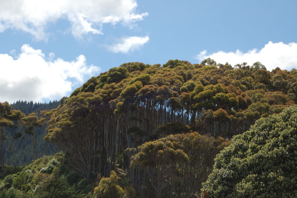 In Wiederaufforstungsregionen findet man neben nordamerikanischen Kiefern und Douglasien v.a. Eucalyptus-Wälder , die hier mit ihren rötlichen Blättern einen besonderen Charakter darstellen