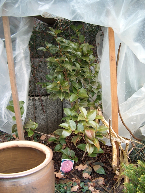 Die Camelia in ihrem Haus. Oberhalb des gefrorenen Mulchs hat sich die äußere Borke abgeschält. MUß ICH MIR GEDANKEN machen??