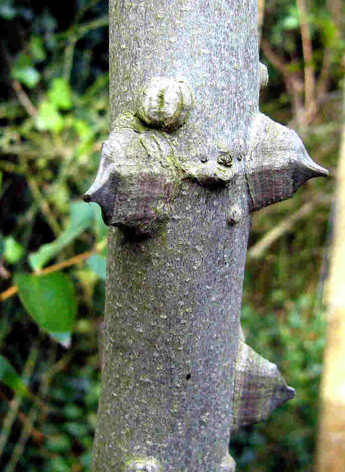 ...und hier das chinesische /*Zanthoxylum simulans*/, hier etwa 6 m hoch mit stumpfen, höckerartigen "Stacheln", die an den Rückenpanzer eines Stegosaurus erinnern.