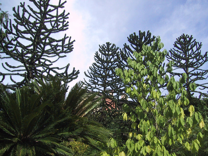 Wohl der exotischste BG der Alpenregion ist der BG "Schloss Trauttmansdorf" in Meran. Im anliegenden Bild:Araucariengruppe(/*Araucaria araucana*/), Cycas revoluta und Asimina triloba