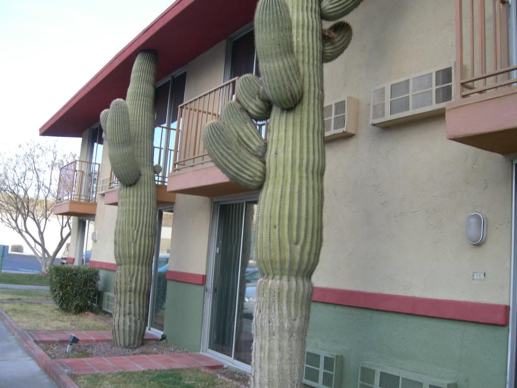 A couple Saguaro growing in Barstow near the Calico ghost town, but these are not native to this part of the southwestern desert. Do you think the roof will come off eventually?