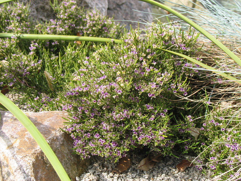 zeigt /*Carmichaelia enysii*/ seine ganze Pracht. In dieser Größe schon ein recht kapitales Exemplar dieses alpinen Neuseelandginsters. Passt von der Optik ungemein gut ins Xerophytenbeet, sollte aber eher am Fuß stehen, wo es nicht ganz so trocken wird.