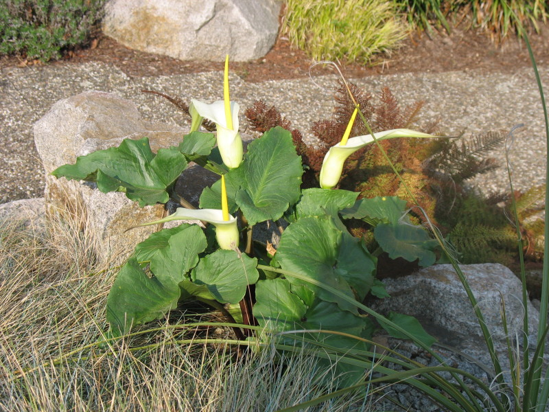 ein relativ kurzes Vergnügen ist die Blüte von /*Arum creticum*/. Die großen Blätter erscheinen bereits im Herbst und sind bemerkenswert winterhart im Vergleich zu anderen mediteranen Arten. Eine Pflanze für Geduldige! Die gelegentlich auf Raritätenbörsen angebotenen Jungpflanzen brauchen meist viele Jahre bis zur ersten Blüte.