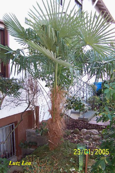 Die Hanfpalme war lange sehr im Schattendruck einer hohen Scheinzypresse und gedeiht auf der Nordseite des Hauses.