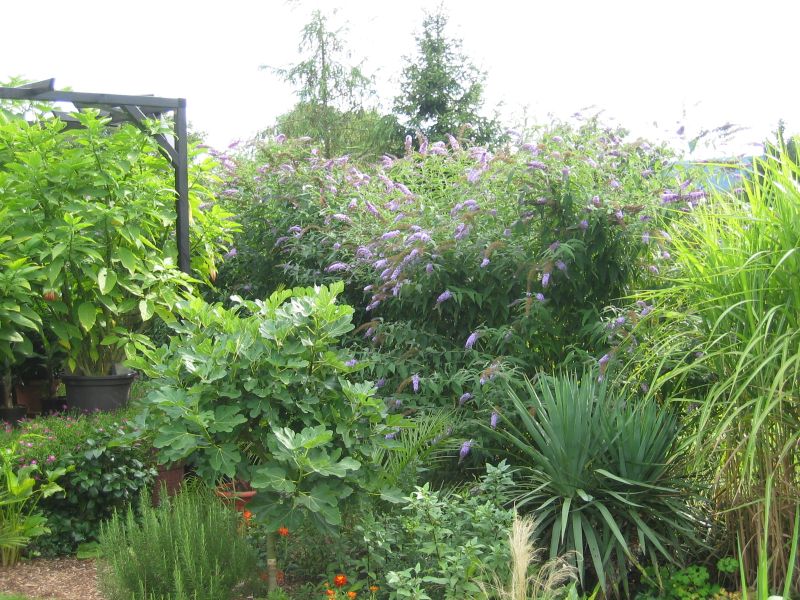 diverse Feigenbäume, Gewürze, und blühenede Hecken + Stauden runden das ganze ab