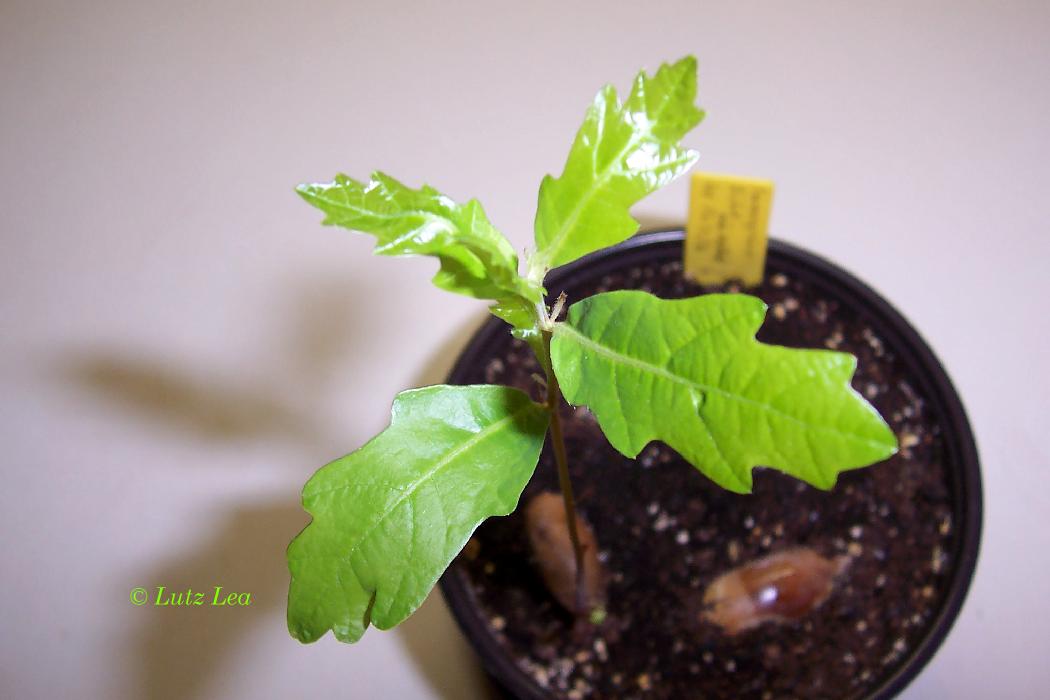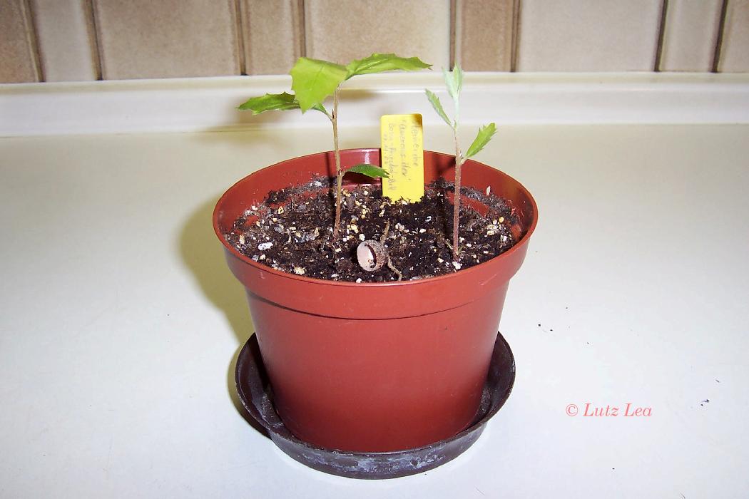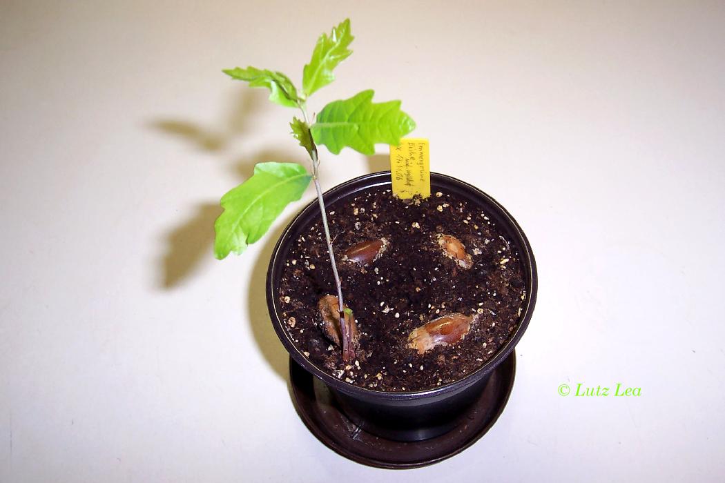 Links zwei gekeimte Steineichen , rechts eine bzw. zwei wintergrüne Eichen aus einer Eichel! Die drei anderen kommen vielleicht auch noch!?