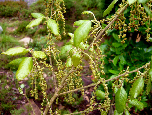 Die Kork-Eiche /*Quercus suber*/ ist in der Winterhaerte vielleicht ein Grenzfall. Die hier vorhandene, als winterhaerteste Auslese gehandelte Sorte Cambridge verliert im Winter die meisten Blaetter, treibt aber sehr schnell wieder aus (ist inzwischen voellig belaubt) und blueht jetzt nach Leibeskraeften.
