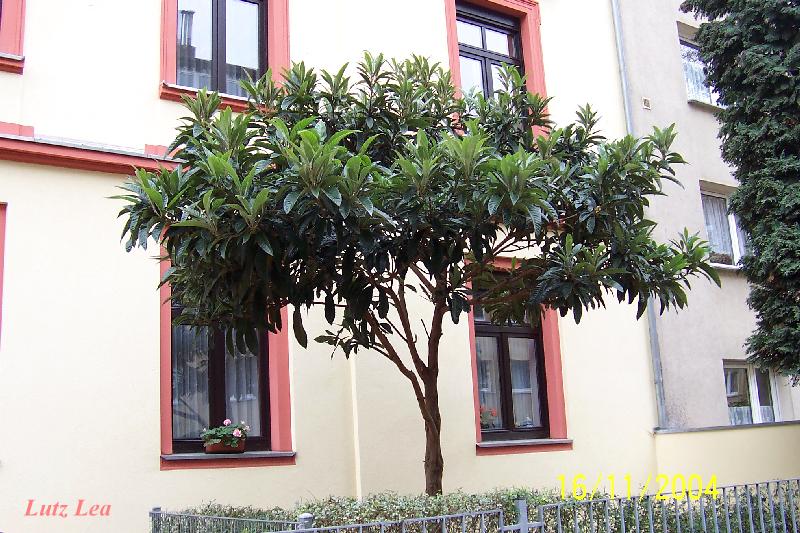 ... wie mir der dortige nette Hausmeister Herr Lüdtke erzählte, hat er von einem Bekannten 1978/79 Samen (Kerne) aus Japan mitgebracht bekommen und gleich eingetpoft. Drei Pflanzen wurden daraufhin 1979 im Vorgarten gepflanzt, wobei zwei Exemplare in einem kalten Winter eingingen! Jenes abgebildete hat bisher standgehalten und erfreut die Anwohner.