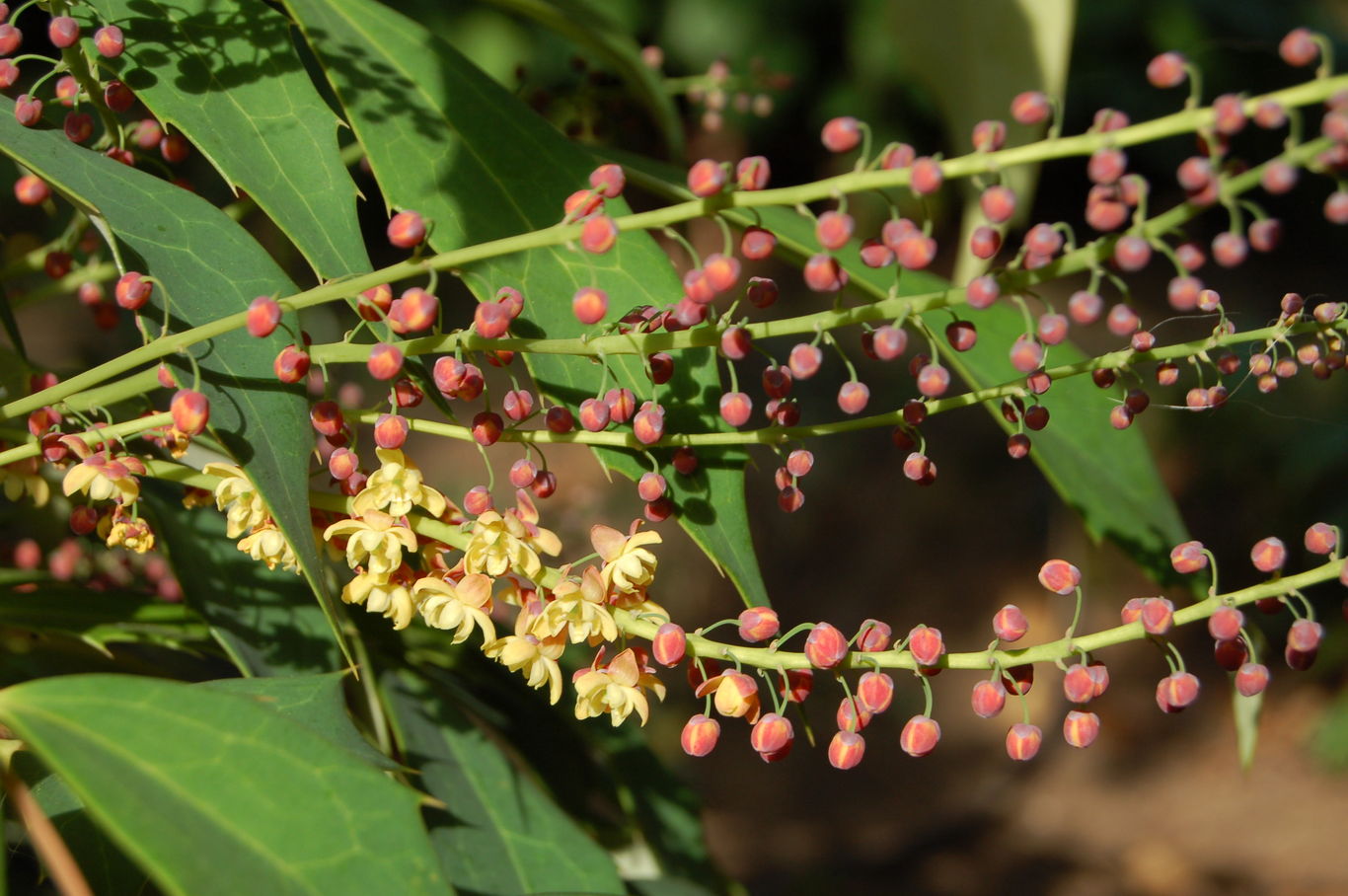 ist /*Mahonia x savalliana*/, hier sehen nur die äußeren Blütenblätter etwas rötlich aus, ansonsten: Typ. Mahonien-Gelb #AM