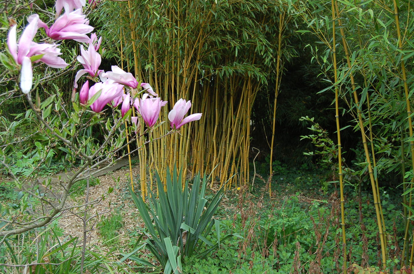 eine der schönsten De Vos-Kosar-Hybriden :"ANN", eine Kreuzung aus der Purpur-Magnolie mit der Sternmagnolie vor Phyllostachys aureosulcata Aureocaulis#AM