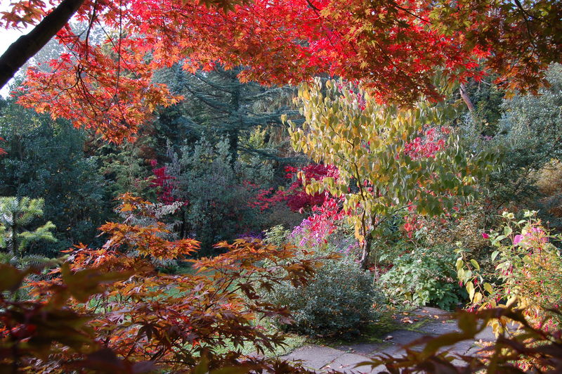 Blick durch /*Acer palmatum Atropurpureum*/ auf Araucaria angustifolia,versch. Cornus-Arten,Davidia und Daphne tangutica