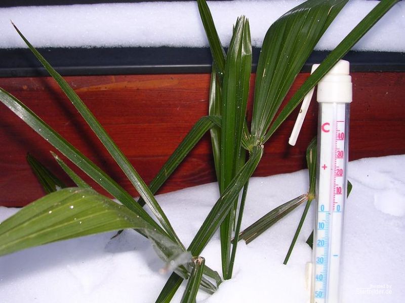 Hier eine Aufnahme einer ausgepflanzten kleinen Südtiroler Trachy. Ich bin mir ziemlich sicher, dass die Trachies keine Schäden davontragen werden (alle Plovvies, südtiroler Hanfpalmen und die große Trachygruppe hatten ja keine geschützten Blätter), weil die -12°C bis -15°C nur ganz kurz unmittelbar vor Sonnenaufgang wirksam waren. Durch die rasche anschließende Erwärmung, waren sie nur ganz kurz im kritischen Bereich. Und bei -15°C und diesen Bedingungen bekommen hier Trachies in der Regel KEINE Winterschäden (die Situation hatte ich schon mal vor einigen Jahren).