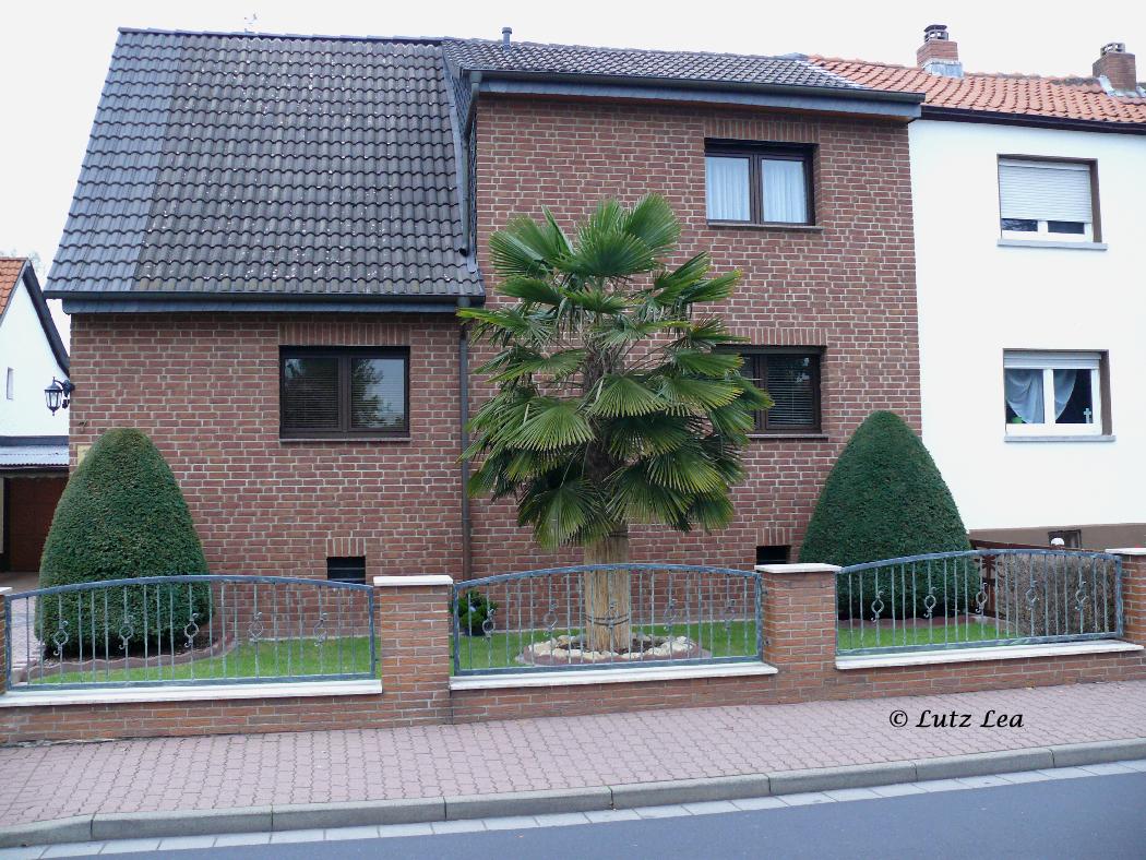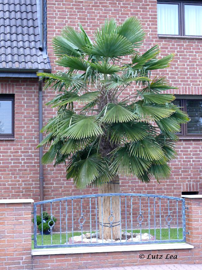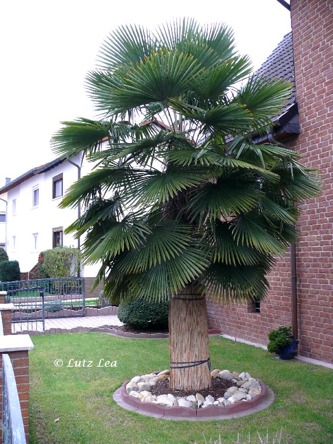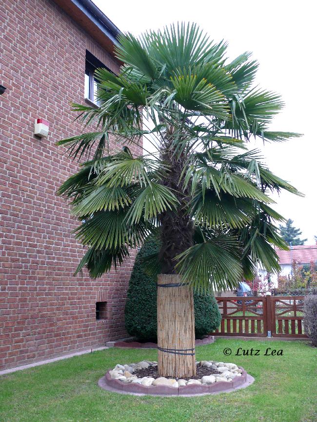 als ich heute Nachmittag auf dem Weg zum "Yucca -Sascha" nach Steinau unterwegs war, bin ich vorher noch schnell bei der tollen Trachy in Erlensee bei Hanau vorbei gefahren. Jene hatte ich vor Jahren entdeckt und hier im 'Forum' auch schon einmal vorgestellt. Die ca. 3,5-4 m hohe Trachy ist seit 1997 ausgepflanzt und wurde bisher in jedem Winter nur mit einer Schilfmatte am Stamm geschützt. So weit ich mich erinnern kann, erzählte mir damals der Besitzer, dass dieses 1a Exemplar vom "berühmten" Erlensee Händler (ganz in der Nähe) stammt!