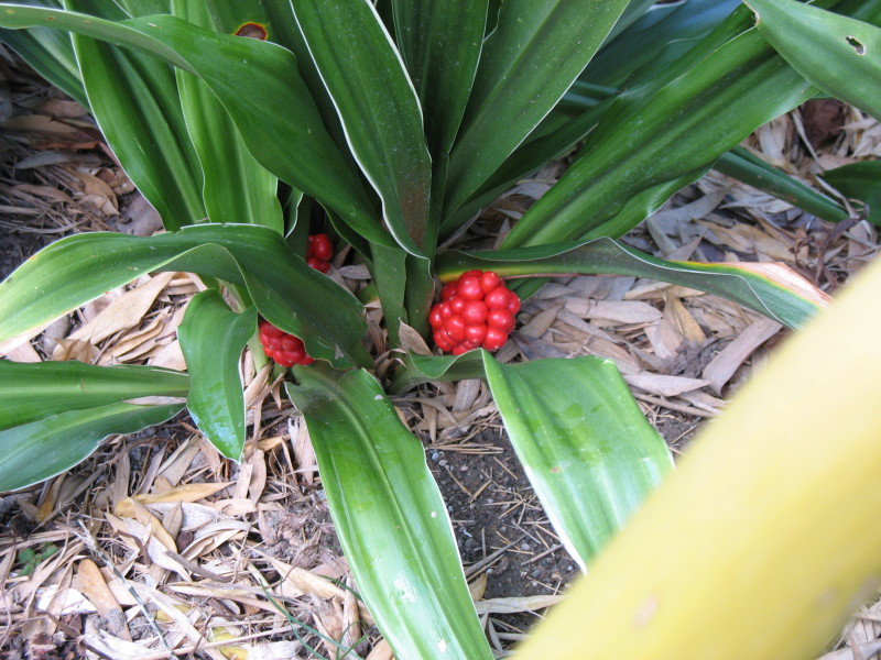 mit Fruchtständen, welche bis zum Frühjahr für Farbe sorgen, hier die weißgerandete hoch aufrechte Sorte 'Miyako No Jo'