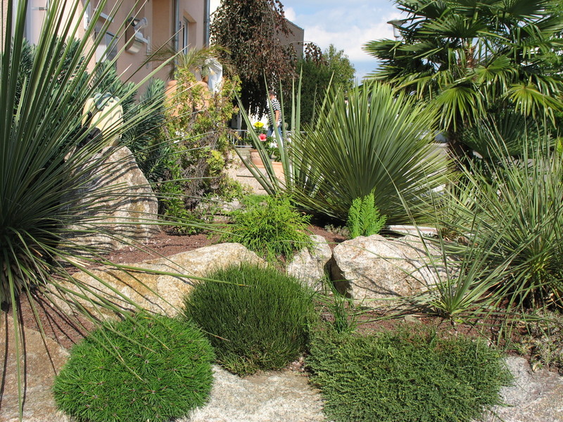 und bei dieser Entdeckung - Bildmitte - streuben sich bei mir sämtliche Nackenhaare, rollen sich die Fingernägel...! Hier wurde der Ausfall eines kleinen Stachelpolsters durch 2 "Pseudozwergkoniferen" aus dem Baummarkt ersetzt. Mit etwas Pflanzenkenntnis und Fantasie weiss man sofort was in den nächsten Jahren mit dem Gärtchen passieren wird...