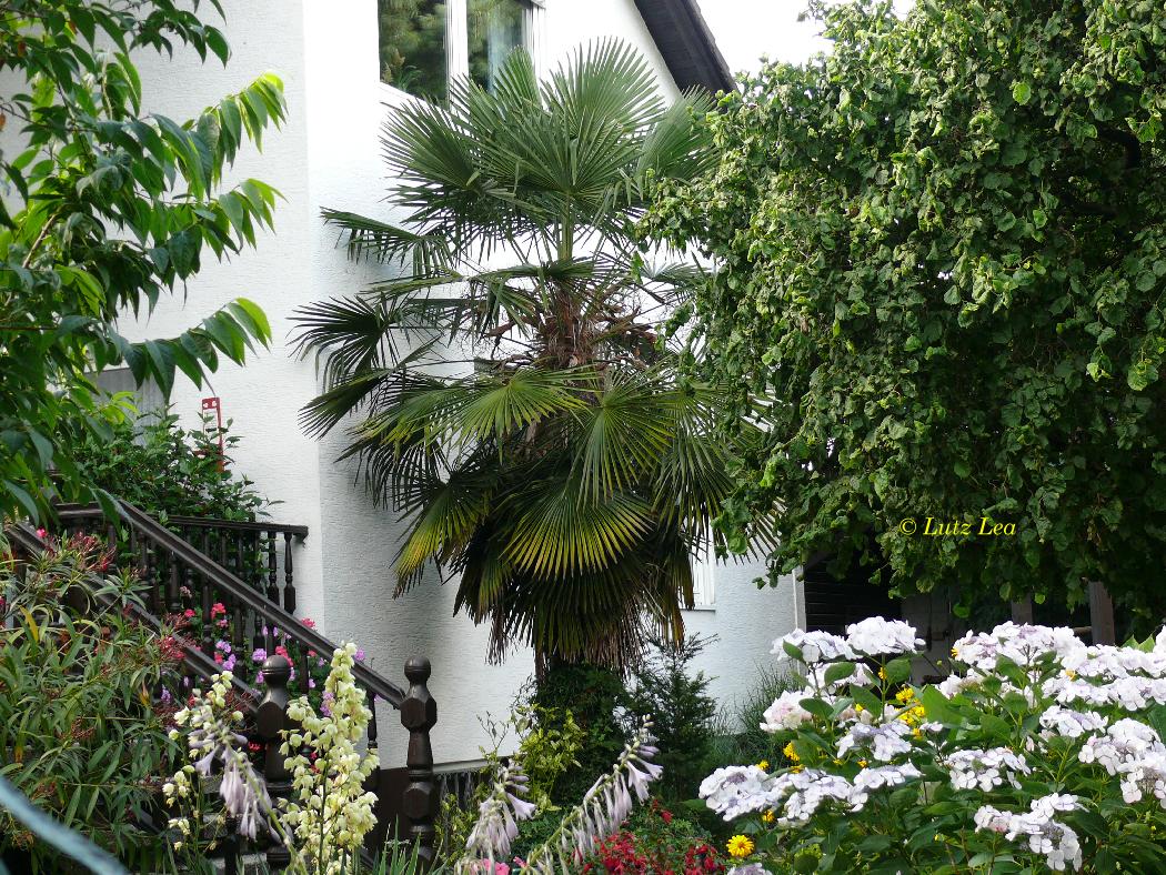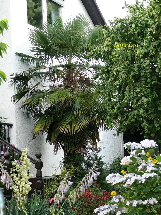 Der Trachy gedeiht direkt an der Oststeite an diesem Wohnhaus. Die Blattkrone hat inzwischen das Fenster im 1. Stock erreicht.
