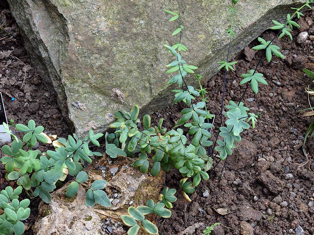 /*Athyrium wardii*/ mit dem spektakulären roten Austrieb, im Hintergrund sieht man noch die Iris pallida ssp. pallida 'Aureomarginata' durchschimmern.