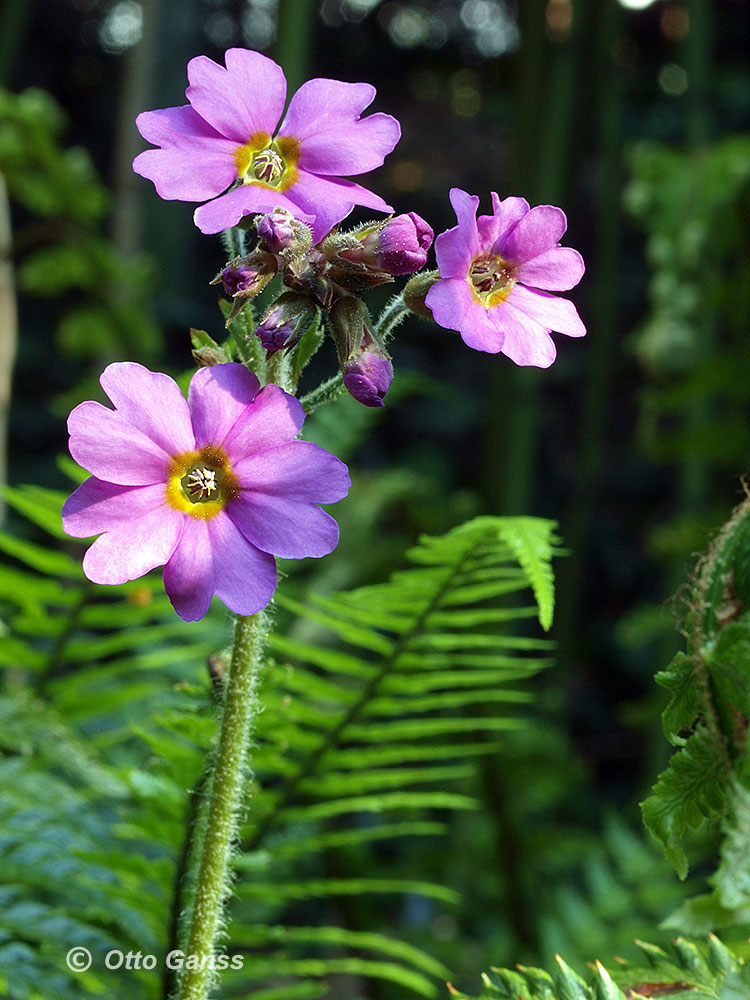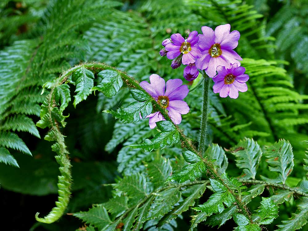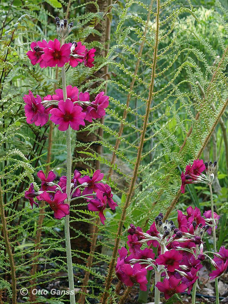 /*Primula pulverulenta*/ dahinter eine seltene Form von Polystichum setiferum 'Lineare' die unglaublich filigran (und schwer zu fotografieren) ist.