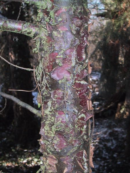 die Rinde löst sich in kleinen Schuppen ab (Farbe dunkelviolett)