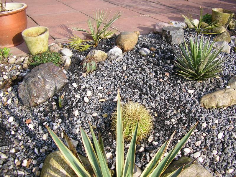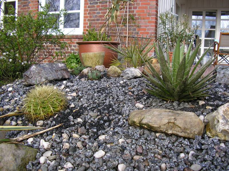 Auf der kleinen Fläche 130 kg Material ausgebracht, Kies,Granit- und Basaltsplitt und teilweise umgesetzt und neu ausgepflanzt: Agave schidigera, Ferocactus covillei und Echinocactus grusonii, allesamt echte Borderline-Kandidaten. ![]()