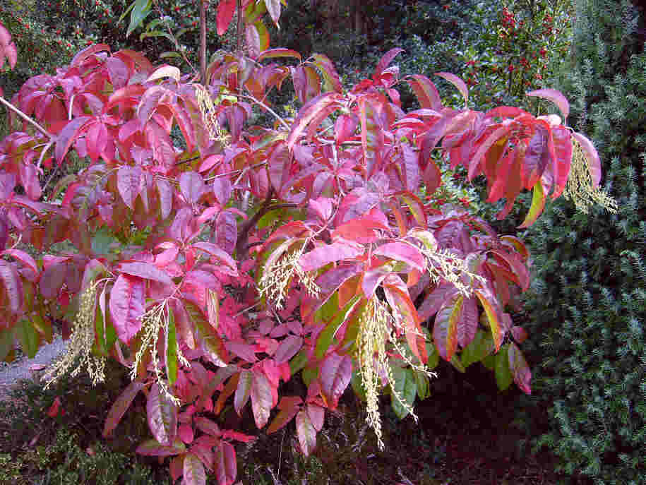 ...Hier nur ein Ausschnitt aus dem jetzt etwa 2,5 m hohem '*Oxydendrum arboreum*/-Baeumchen. Die scharlachrote Faerbung ist einmalig und weithin auffallend.