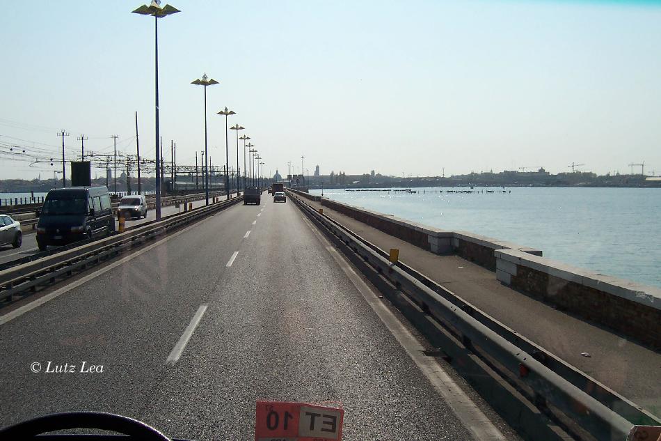 Fahrt bei herrlichstem Wetter mit dem Reisebus über den Damm bei Mestre - Venedig kommt in Sichtweite.