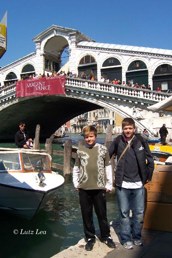 Sohnemänner Daniel und Lucas vor der Rialto Brücke.