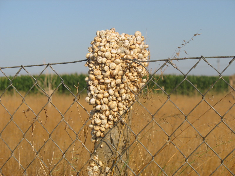 alle Zaunpfosten sahen so aus und einige dazwischenstehende Telegraphenmasten. Weshalb nun die Schnecken die trockene Zeit nicht am Boden sondern in luftiger Höhe verbringen, welche Strategie dahintersteckt, darüber kann ich nur spekulieren: vielleicht heitzt sich der Boden in der Sonne zu stark auf????? - oder aber damit sie nicht sofort ersaufen wenn die Trockenheit durch die dort typischen Wolkenbrüche plus Überschwemmungen beendet oder unterbrochen wird????