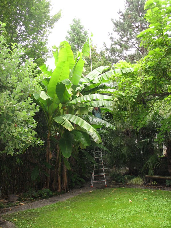 und hier beim Versuch die Höhe zu bestimmen. Nicht ganz einfach, aber mit Stehleiter und ausgestreckten genau 4 m langen Hochentaster ergab sich eine Höhe von ca. 7,80 m. Aus allen Scheinstämme rollen sich noch neue Blätter, das ist noch nicht das Ende und noch keine Blüte in Sicht für diese Saison