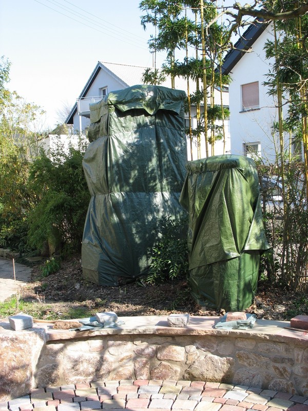 Hier noch ein Foto mit Winterschutz (dicht verpackt mit Gewebeplanen), nur die Mulchschicht am Fuß der Stellage habe ich bereits vor 3 Wochen entfernt.